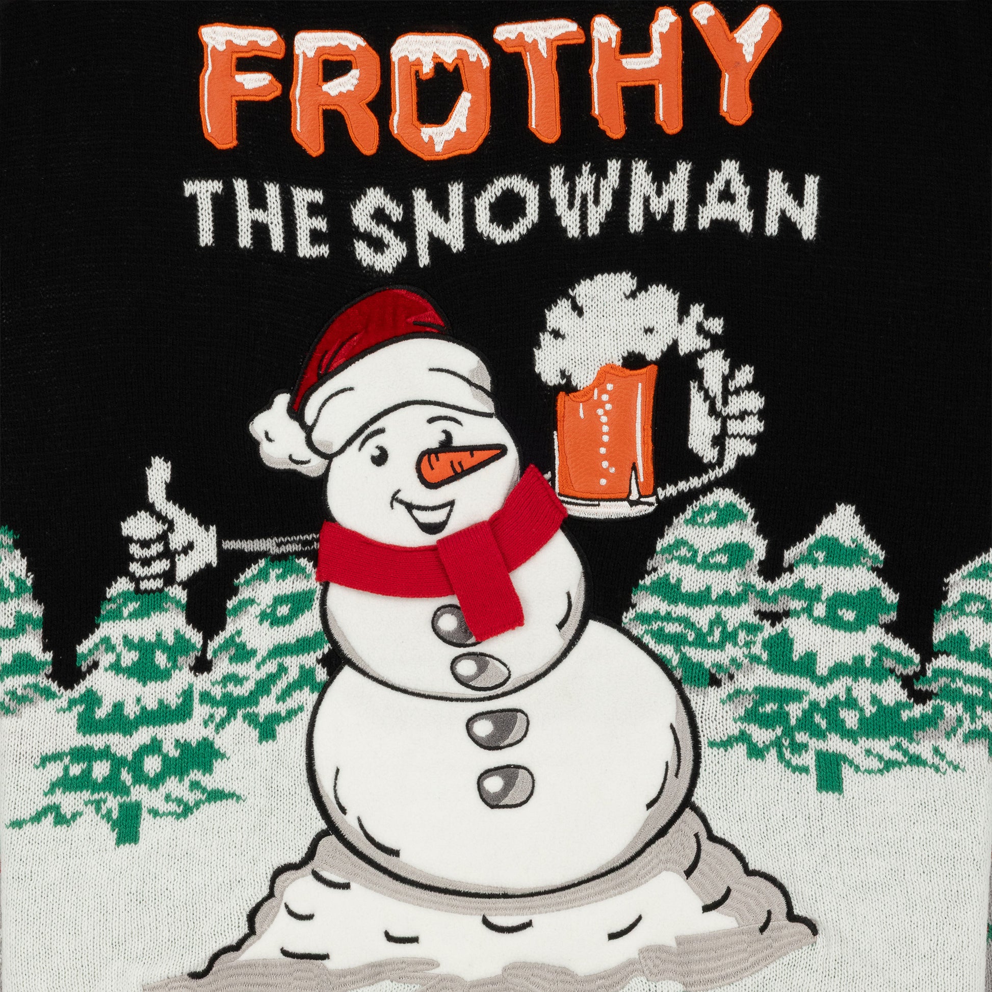 Raise a glass to the jolliest drinking buddy of them all—Frothy the Snowman. This festive sweater features everyone’s favorite frosty friend holding up a foamy pint, with knit-in beer bottle patterns down the sleeves and across the back for extra holiday hops.